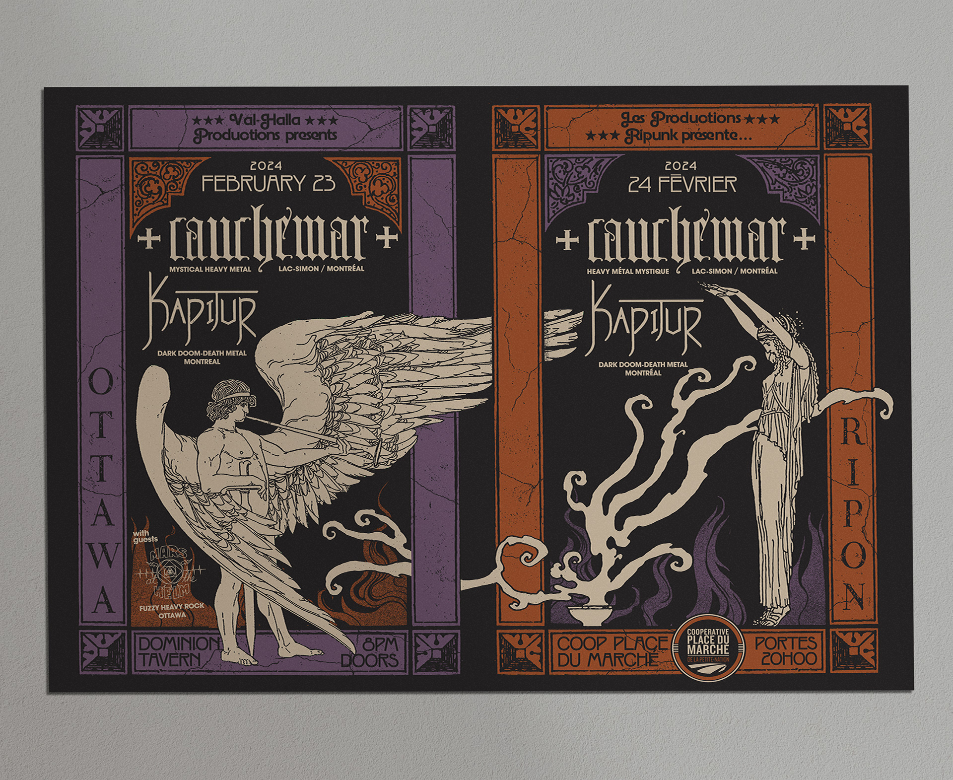 This diptych poster set is designed as a unified collectible, encouraging concertgoers to attend both shows to complete the full visual composition. Each poster stands on its own with a distinct color identity; one in muted violet tones, the other in burnt orange, while sharing a consistent ornamental frame and typographic style inspired by Art Nouveau and vintage concert ephemera.